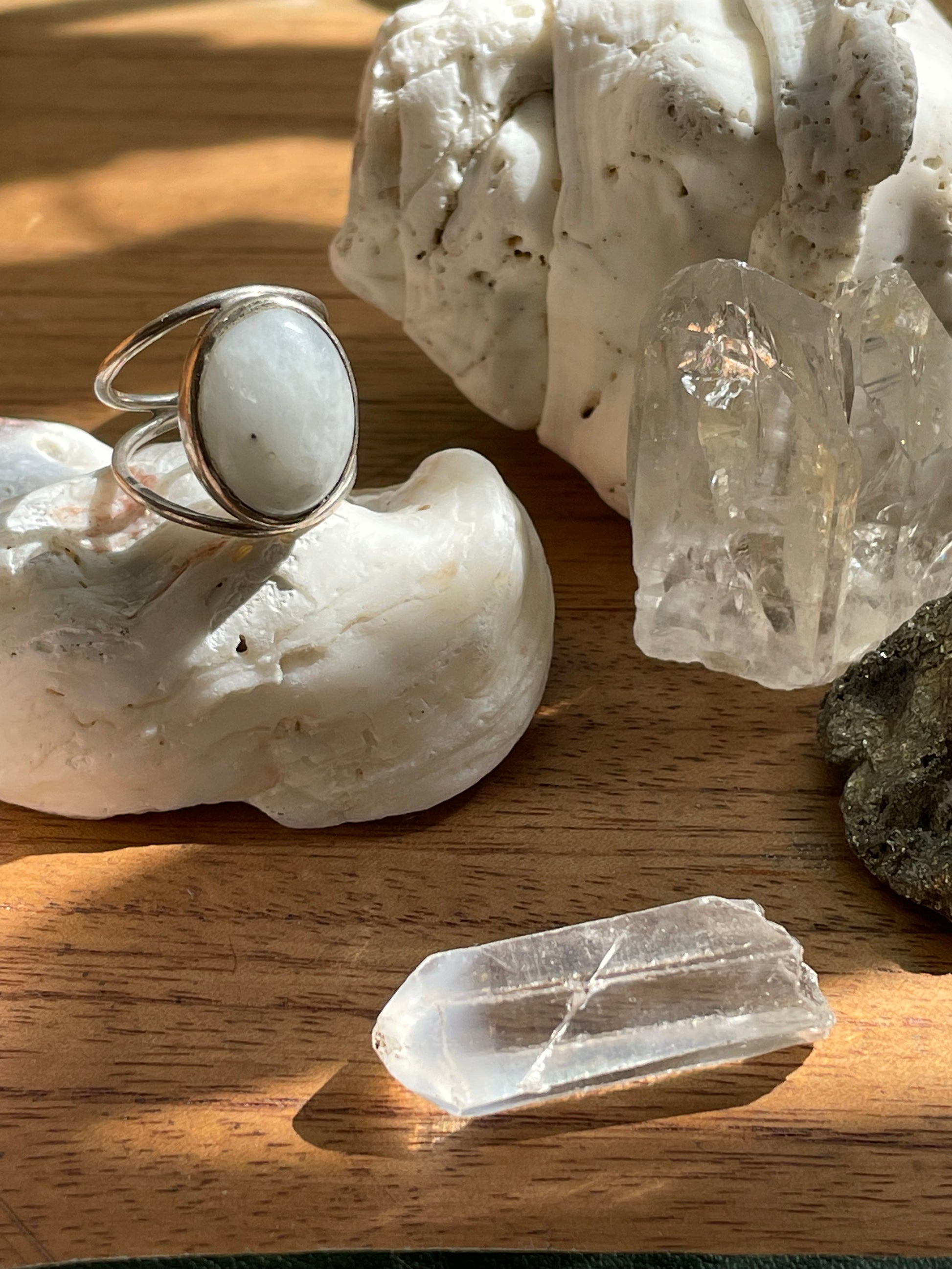 Inspirado en las noches mágicas de Bali, este anillo refleja la conexión entre el océano y el cielo. Según La Biblia de los Cristales de Judy Hall, la piedra luna está vinculada al chakra del tercer ojo y sacro, potenciando la intuición, la empatía y la calma emocional.
