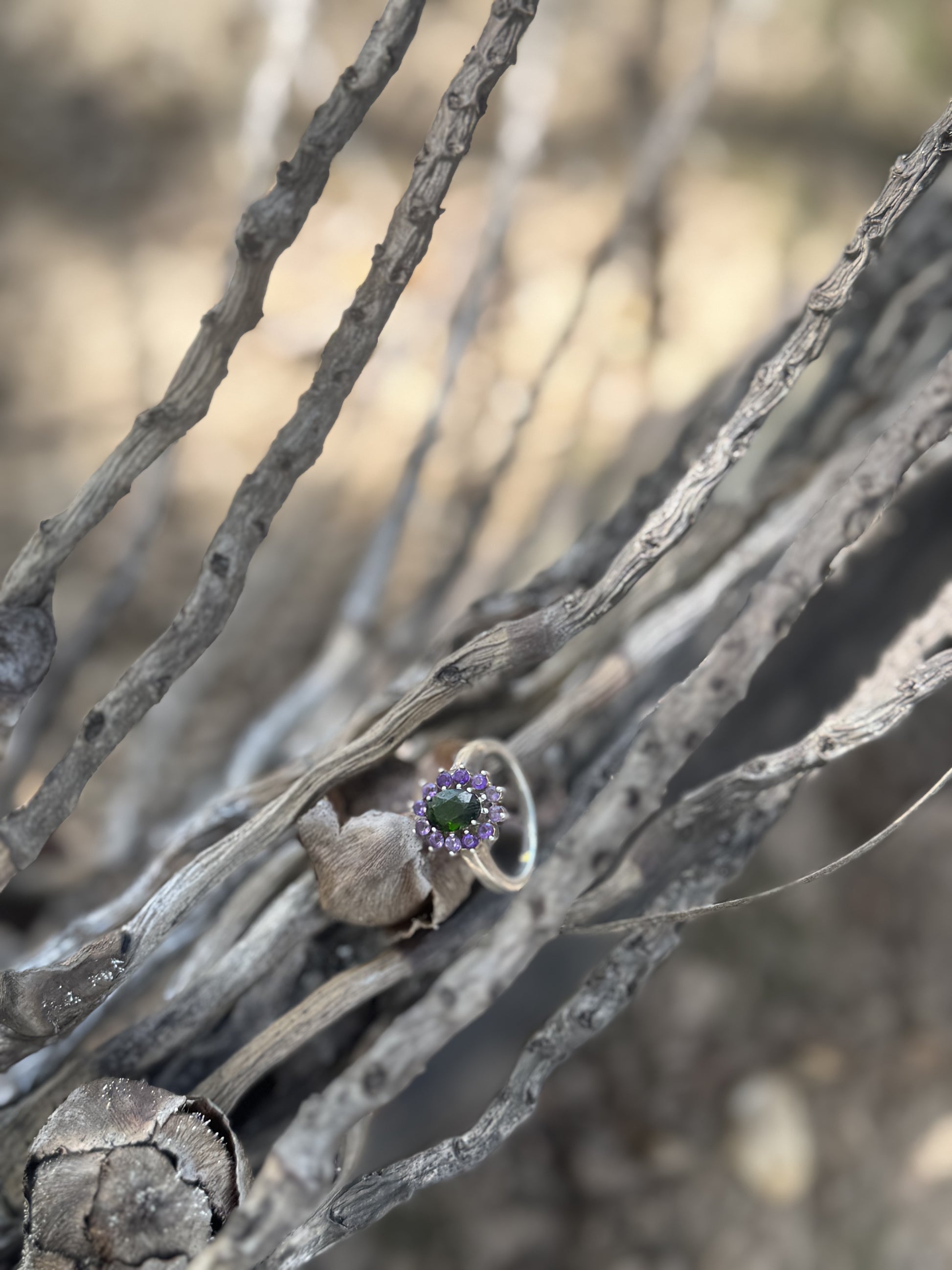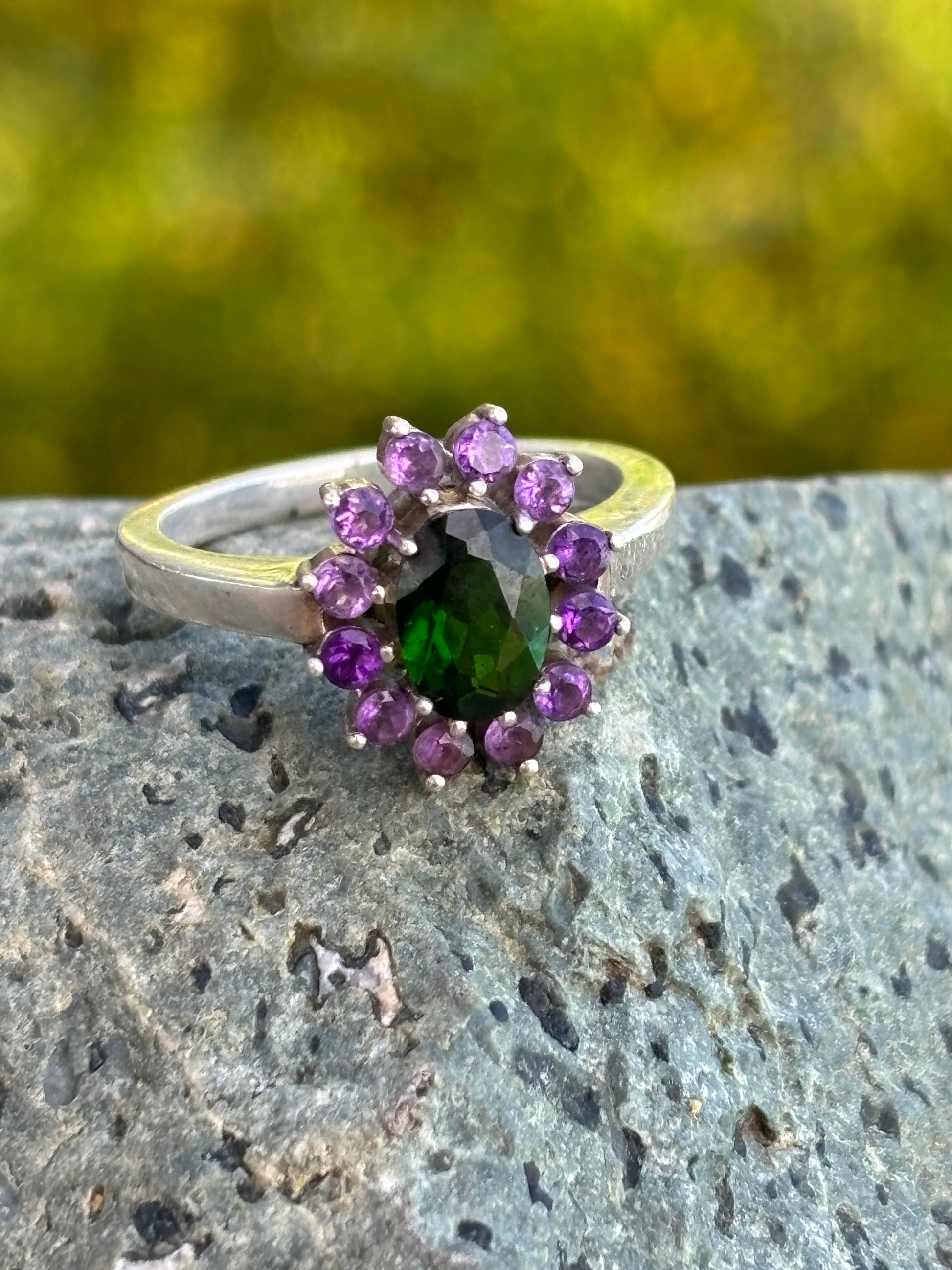 Anillo Jardín de Bali, una marquesa en plata 925 con tsavorita y amatistas. La Tsavorita despierta vitalidad y prosperidad, mientras las Amatistas aportan claridad y calma.