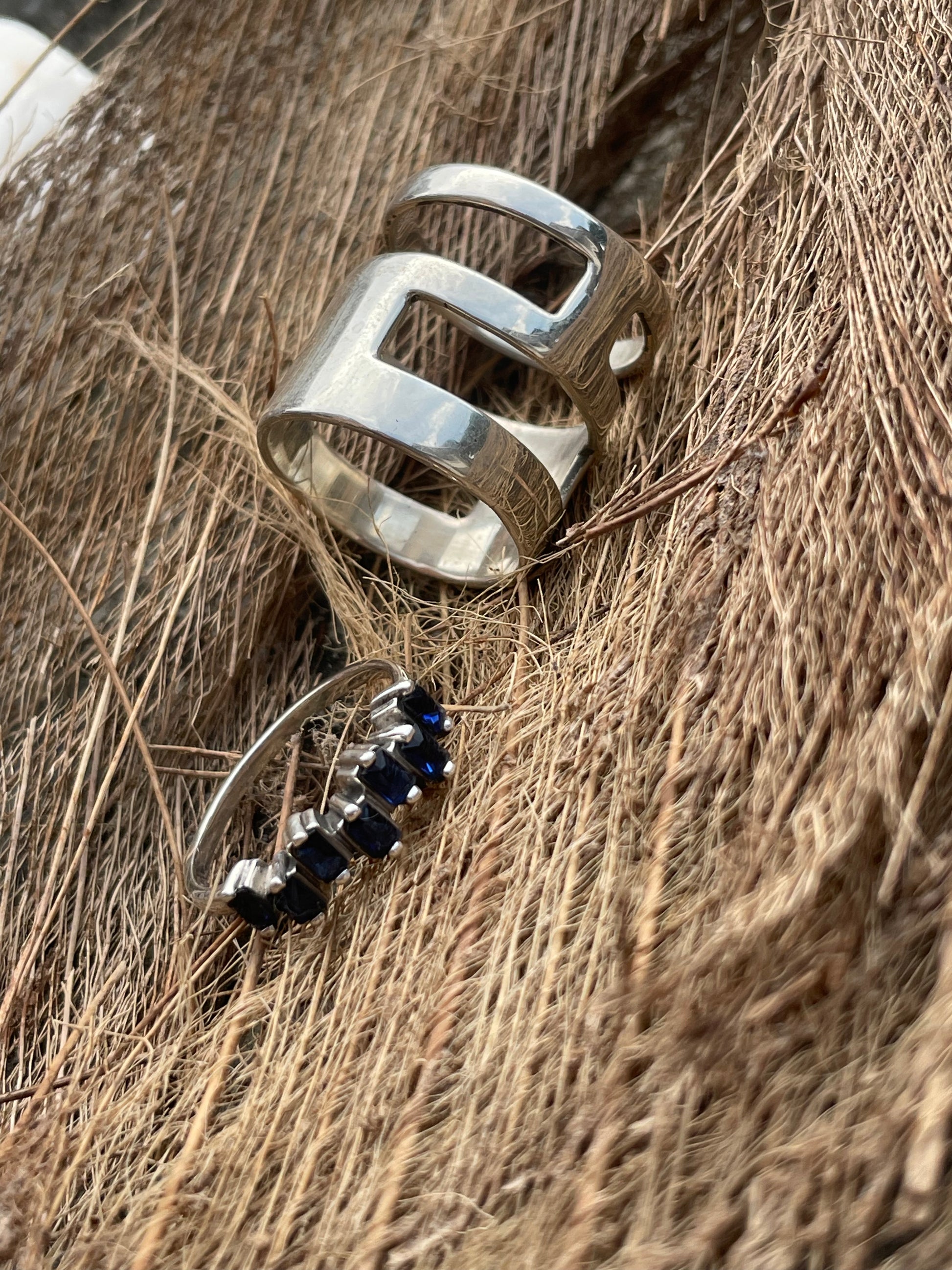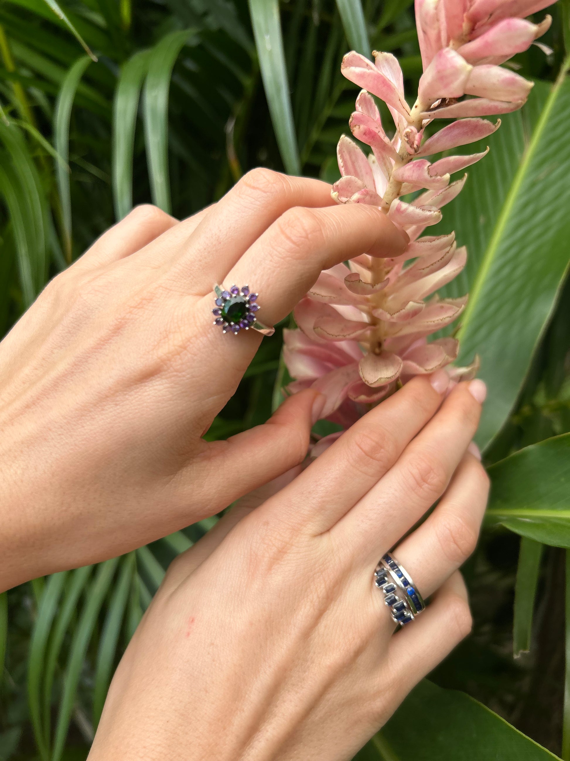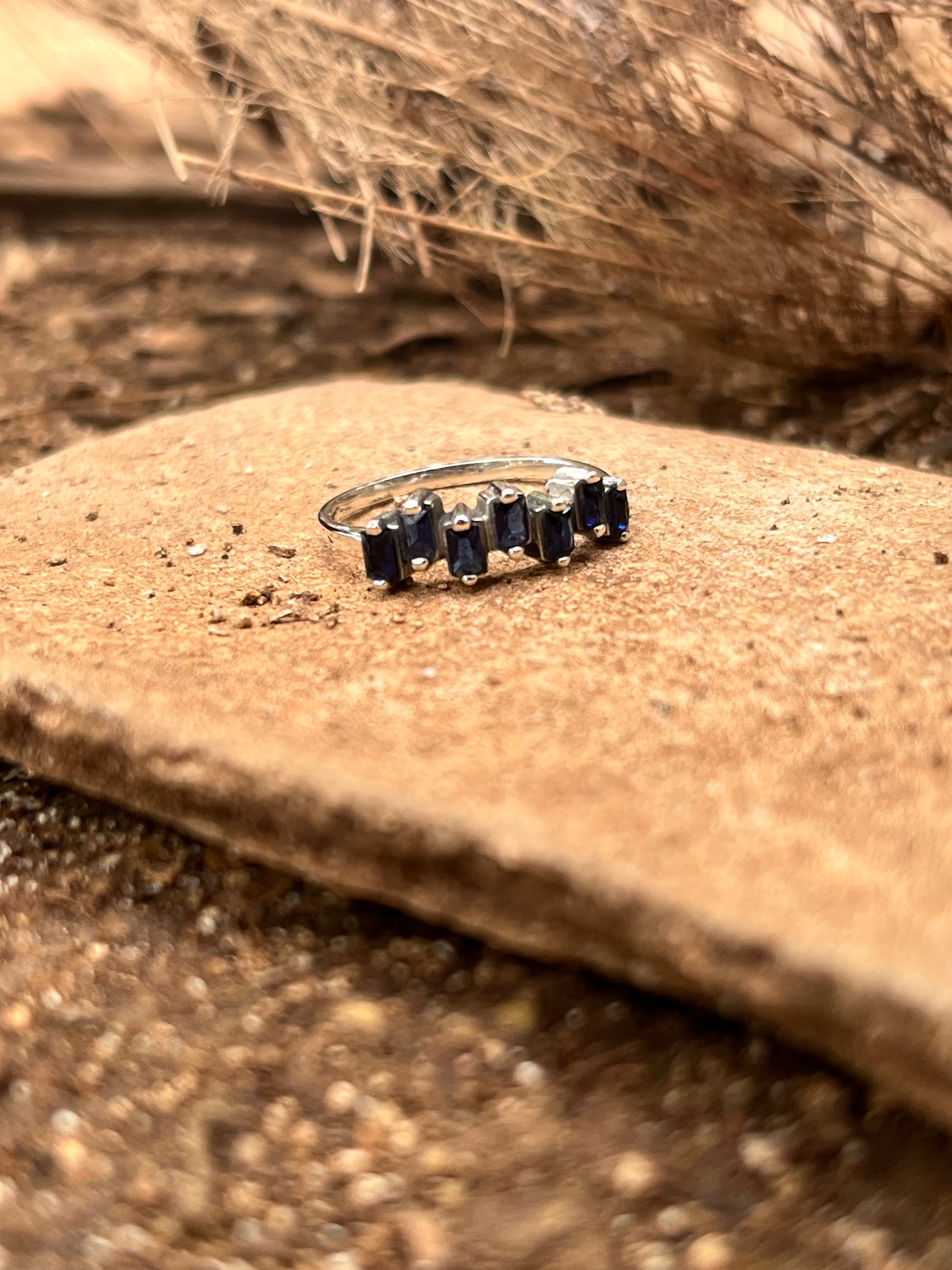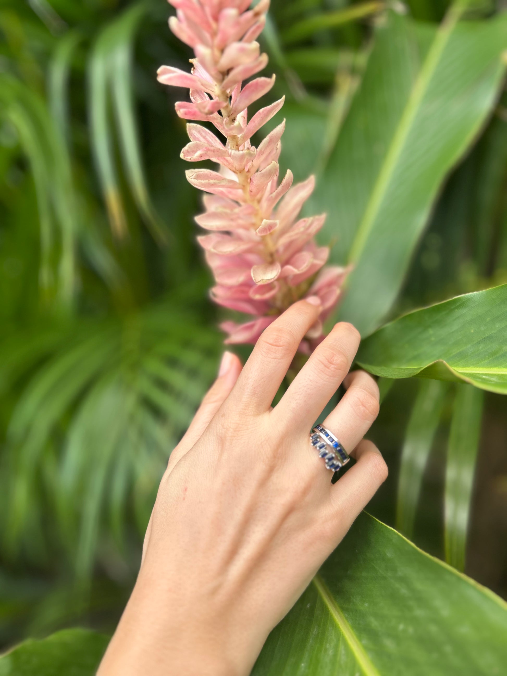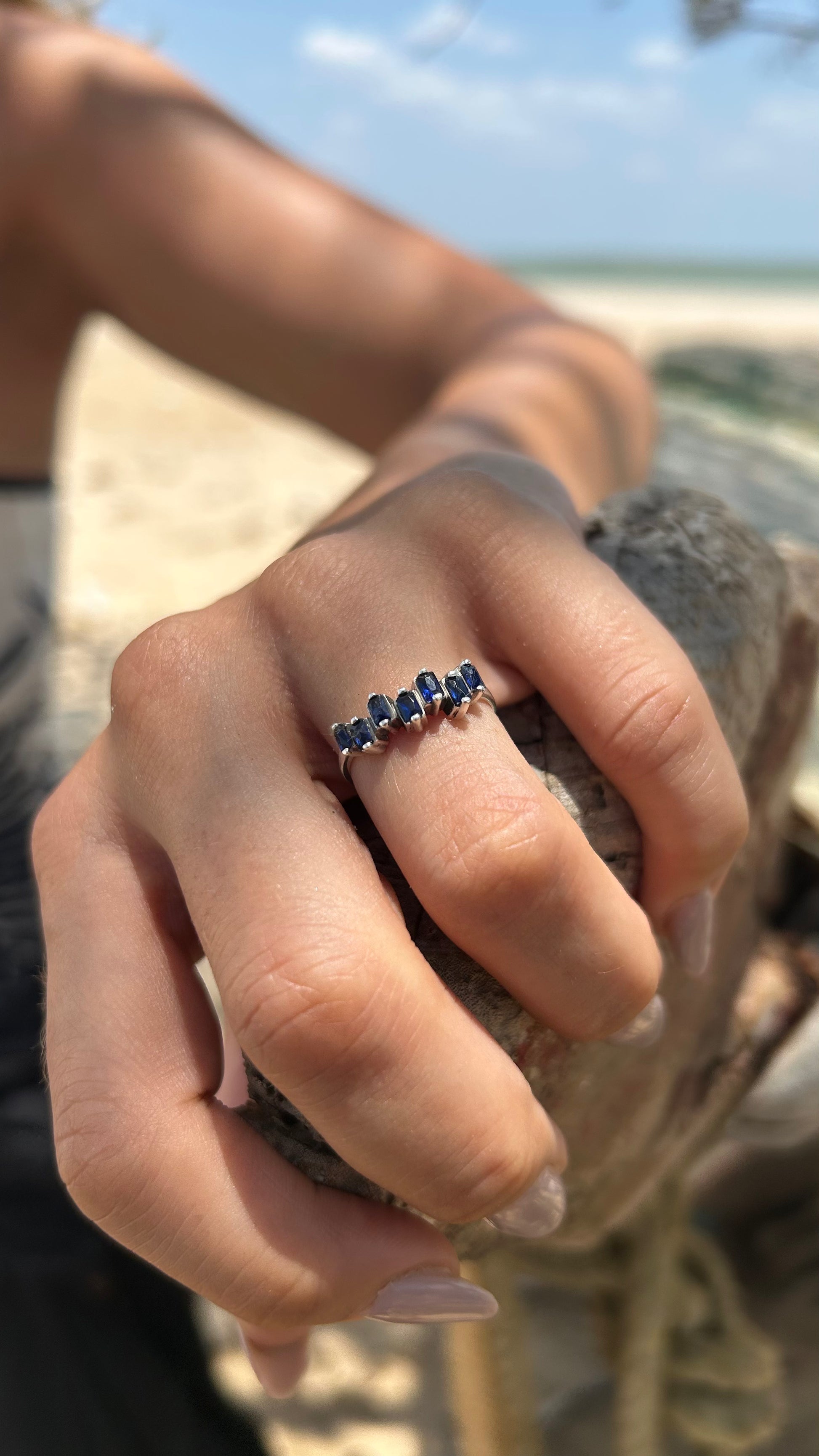 Anillo Marea Azul, en plata 925 con circones azules, un talismán que irradia calma y claridad. Su brillo refleja las aguas serenas de Bali, invitándote a fluir con paz.