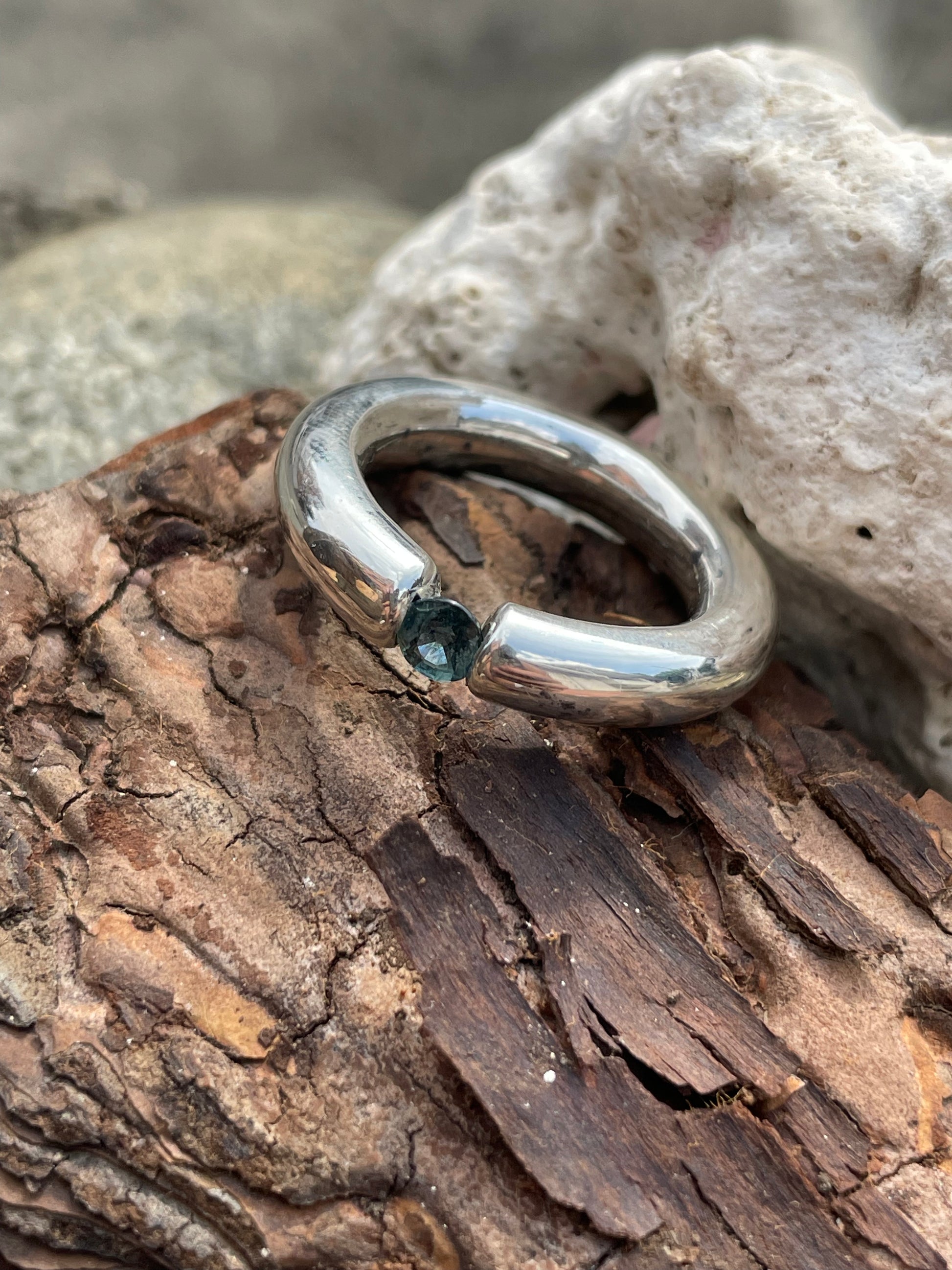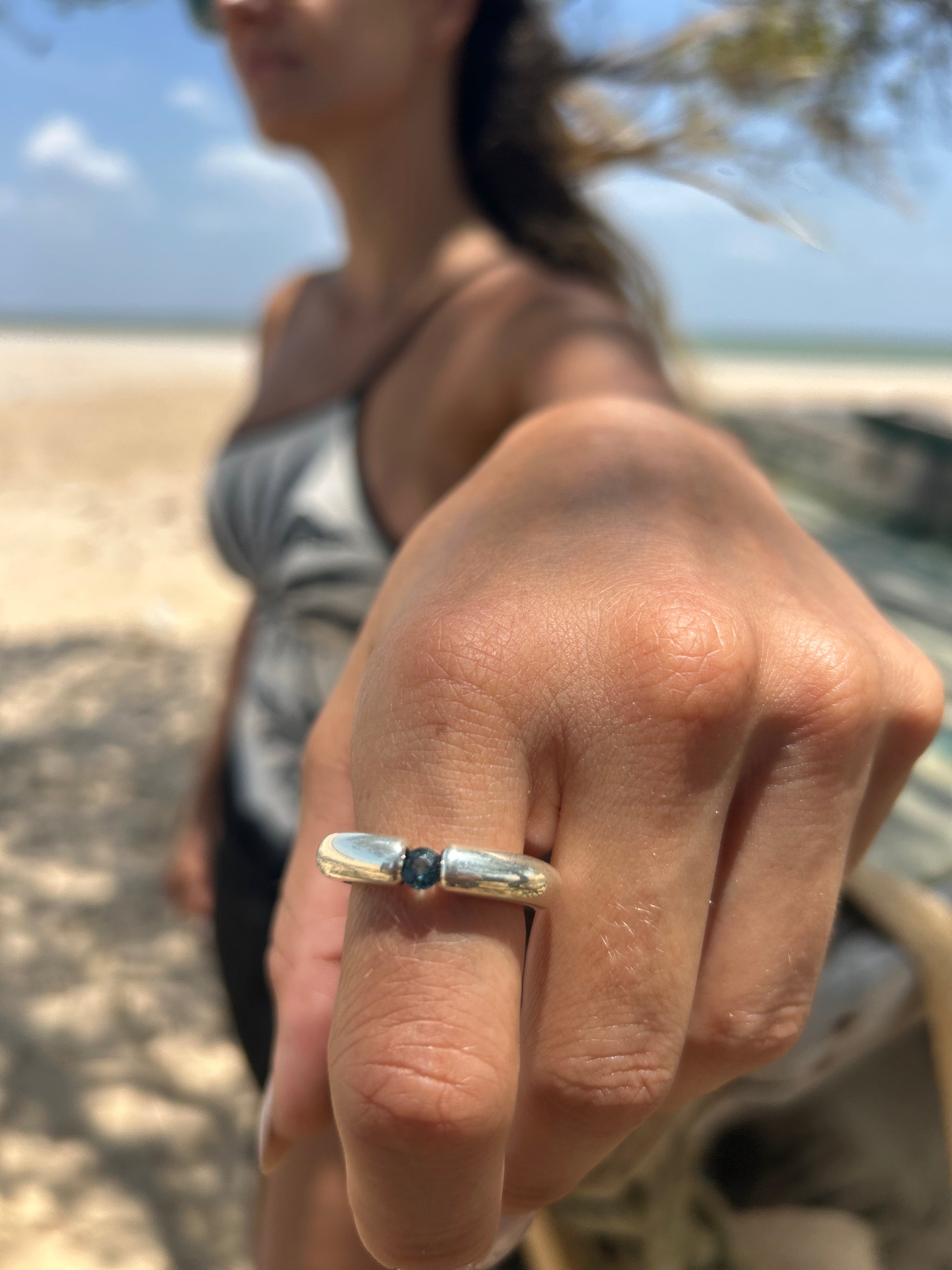 Anillo Tundra, en plata 925 con zafiro azul, un talismán de sabiduría y paz. Su gema, un destello de verdad, calma tu mente y abre tu intuición.